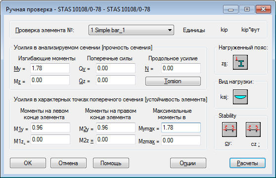 2. в поле Внутренние усилия в анализируемом сечении ввести значения соответствующих внутренних сил (доступные значения показаны в правом верхнем углу диалогового окна);