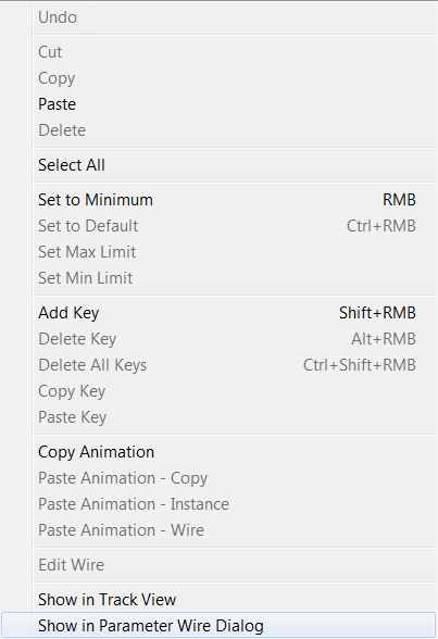 要打开微调器右键单击菜单,右键单击可设置动画的参数的可编辑字段。此菜单提供用于在不同对象参数之间剪切、复制和粘贴值、线和动画轨迹的多个选项。它还允许您在轨迹视图或在“参数关联”对话框中显示参数。