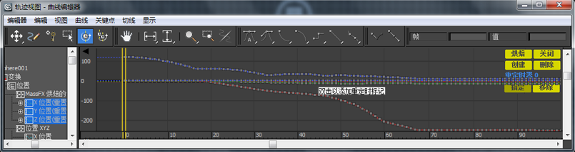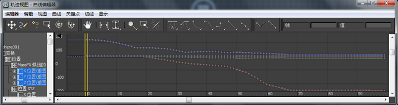 此时将在“曲线编辑器”模式下打开“轨迹视图”。在“轨迹视图 - 曲线编辑器”的“层次”窗口中将仅高亮显示选定对象的动画轨迹。这是默认行为。
