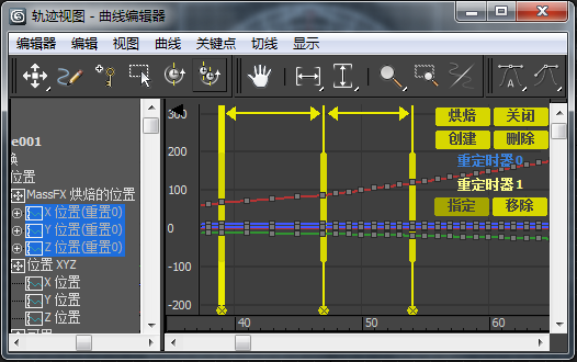 2. 在“轨迹视图”窗口左上角附近的重定时工具按钮簇中,单击“烘焙”。