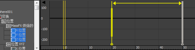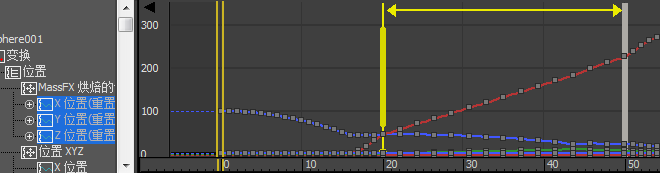 当重定时工具处于活动状态时,任何时候在“轨迹视图关键点”窗口中双击都可添加垂直黄色标记。每对相邻的标记构成一个时间跨度,可以通过移动任一标记扭曲该时间跨度。