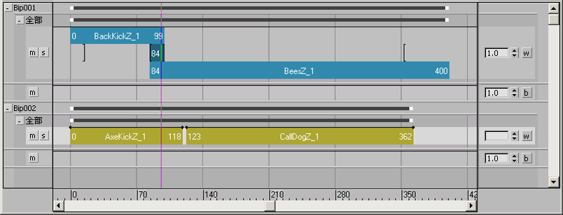 每个 Biped 的范围条可以被移动或伸缩,以此来移动或伸缩 Biped 的整个混合。