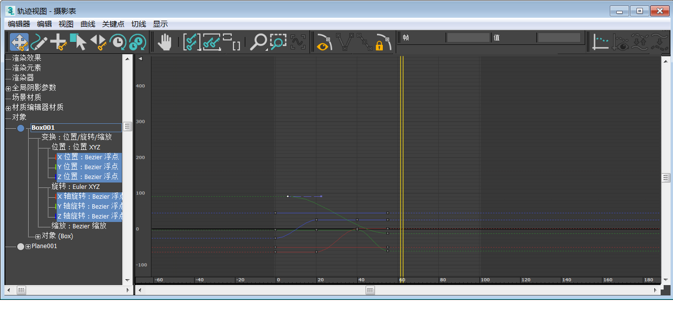 曲线编辑器是一种轨迹视图模式,可用于处理在图形上表示为函数曲线的运动。使用它,您可以查看运动的插值:3ds Max 在关键帧之间创建的对象变换。使用曲线上的关键点及其切线控制柄,可以轻松查看和控制场景中各个对象的运动和动画效果。替代模式为摄影表,用于直接使用关键点而不是曲线。