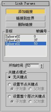 一旦指定链接约束,可以在“运动”面板的“链接参数”卷展栏上访问它的属性。在此卷展栏可以添加或删除目标并在每个目标成为活动的父约束对象时设置动画。