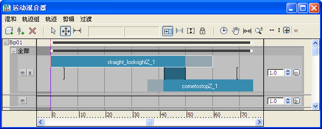 与运动流非常类似,在混合器中,基于脚的运动剪辑(IK 约束使脚在不同的时间内限制在一定位置的剪辑)之间的变换必须小心放置和调整,以使动画看上去更自然。工作流程取决于是正在设置 Biped 还是 3ds Max 对象(如装备的角色)的动画。