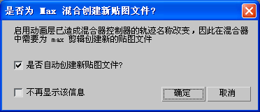但是,如果在单击“确定”之前,取消“是否自动创建新贴图文件?”,将不生成任何贴图文件,并且下次打开场景文件时将提示您创建贴图文件。如果没有贴图文件,则动画不会正确显示。