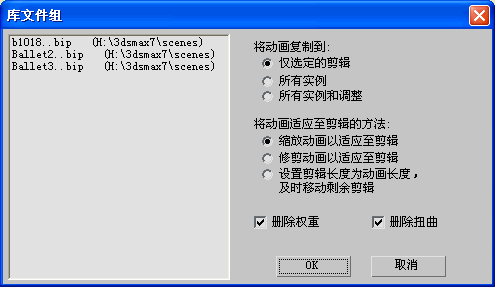 - 所有实例和调整用从库中选择的剪辑替换混合器中所有 Biped 轨迹上选定剪辑的任何实例(调整)。