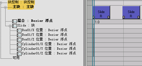 “块”控制器是一种全局列表控制器,使用该控制器可以合并来自多个对象跨越一段时间范围的多个轨迹,并将它们组织为“块”。这些块接下来可用于在时间上的任何地方重新创建动画。可以在“轨迹视图”中添加、删除、缩放、以图形方式移动“块”并将其保存。“块”既可以表示绝对动画也可以表示相对动画。