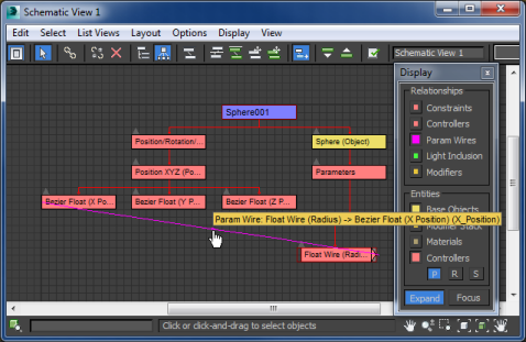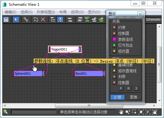 如果参数是在场景节点中关联,例如对象相对于修改器参数的位置应用到对象,则可能不容易在“图解视图”中看到关联。但是,您可以使用其他显示选项来显示关联。