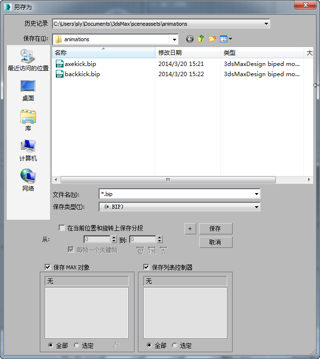 当保存 FIG 文件时(在体形模式),“另存为”对话框是一个标准的 Windows“保存文件”对话框。然而,当保存 BIP 或 STP 文件时,可以将对象和动画控制与该文件一起保存。
