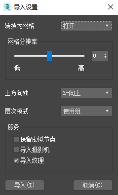 - 展平:不对对象进行分组,而是作为独立的 3ds Max 对象导入它们。