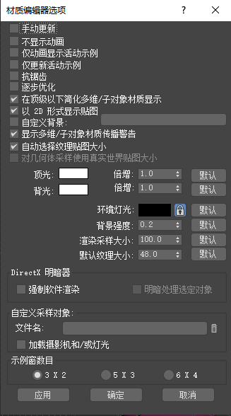 - 在不离开“材质编辑器选项”对话框的情况下,应用当前设置,“示例窗”组中的更改除外。调整示例窗的灯光值时,该选项非常有用。