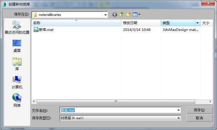 3ds Max 使用您输入的名称将库保存为 MAT 文件;例如 New Library.mat。 库的默认位置为当前项目中的 \materiallibraries 文件夹。如果尚未设置项目文件夹,则会将新库保存在文件夹 <3ds Max 程序文件夹>\materiallibraries 中。