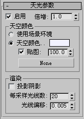 [贴图控件]可以使用贴图影响天光颜色。该按钮指定贴图,切换设置贴图是否处于激活状态,并且微调器设置要使用的贴图的百分比(当值小于 100% 时,贴图颜色与天空颜色混合)。