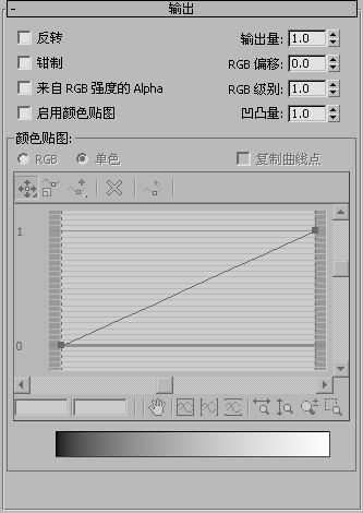 此卷展栏中的控件与内置输出选项的贴图控件相同。请参见“输出”卷展栏。