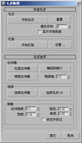 这些是用于模拟的主要控件,其中与拉伸器连接的弹簧将把毛皮接缝顶点拉开,以展平 UV。为得到最佳结果,请在运行模拟(单击“开始毛皮”)和松弛网格之间交替。