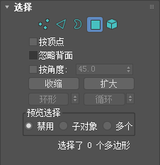 “选择”卷展栏提供用于访问不同子对象层级和显示设置的工具,以及用于创建和修改选择的工具。其中还显示有关选定实体的信息。