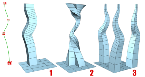 可以挤出单个多边形 (1) 或多个选择的连续多边形 (2) 或非连续多边形 (3)。挤出 2 使用“锥化曲线”和“扭曲”(可通过“设置”访问)。挤出 3 使用“锥化量”;每个挤出有不同的曲线旋转。