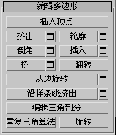 在“元素”子对象层级,该卷展栏包含常见的多边形和元素命令。在“多边形”层级,它包含这些命令和多边形特有的多个命令。在这两个层级都可用的命令包括:“插入顶点”、“翻转”、“编辑三角剖分”、“重复三角算法”和“转变”。