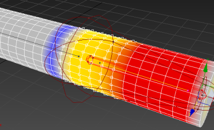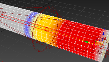 选择骨骼末端效应器 (IK Chain01) 并四处移动它。 圆柱体会变形为跟随骨骼。要调整封套以细化曲面变形,选择“蒙皮”修改器的“封套”子对象层级,然后使用“编辑封套”控件调整封套的大小和更改顶点权重。