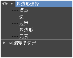 “多边形选择”修改器可以在堆栈中为后续修改器向上传递一个子对象选择。它提供在可编辑多边形中可用的选择功能的超集。可以选择顶点、边、边界、多边形和元素。也可以将选择从子对象层级更改到对象层级。