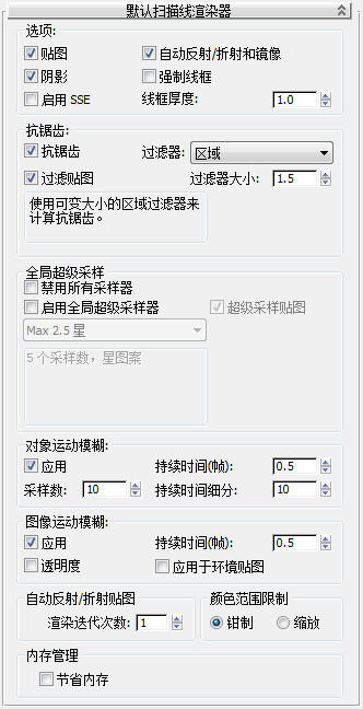 提示: 请保持启用“超级采样贴图”选项,除非在进行测试渲染并想加速渲染速度和节省内存时。