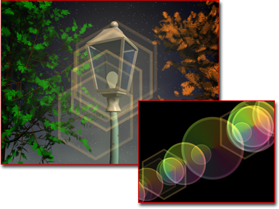 二级光斑是可以正常看到的一些小圆,沿着与摄影机位置相对的轴从镜头光斑源中发出。这些光斑由灯光从摄影机中不同的镜头元素折射而产生。随着摄影机的位置相对于源对象更改,二级光斑也随之移动。