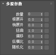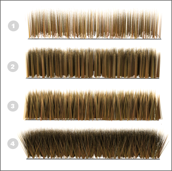 在以较低频率使用卷发时将会自然创建某种程度的聚集,但是在此可以通过多股参数进一步改善相应效果。对于正常渲染的每根毛发,多股将在原始头发周围渲染一绺附加的毛发。“展开”设置控制毛发在根和梢部散开的程度,多股数量控制创建用于附加毛发绺的毛发数量。通过展开或压缩梢部和根部,即可使用“展开”创建聚集的效果。