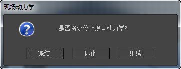 如果在使用现场动力学效果时按 ESC 键,3ds Max 会显示一个对话框,询问您是否希望停止现场动力学效果。“冻结”和“停止”都会将该模式重置为“无”,但是“冻结”会在其当前位置冻结该头发。可以将此作为预计算动力学效果的起始点,或作为设计头发设计的点。