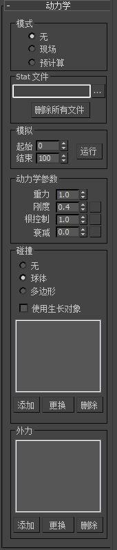 确定模拟的范围,然后加以运行。只有在选择“预计算”模式并在“Stat 文件”组中指定 stat 文件后,这些控件才可用。将“开始”和“结束”设置到模拟开始和结束的帧处,然后单击“运行”按钮。3ds Max 随后将计算动态参数并保存 Stat 文件。