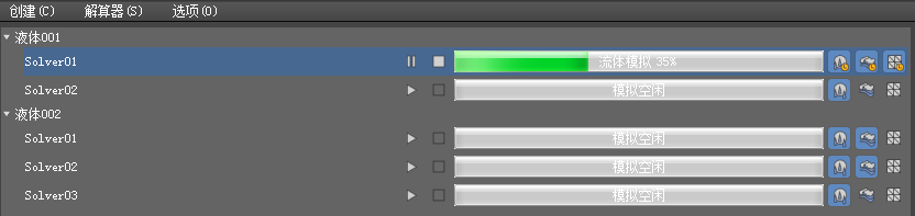 使用“解算器区域”可以管理液体和解算器、启动和停止解算、监视模拟进度,以及选择模拟组件。