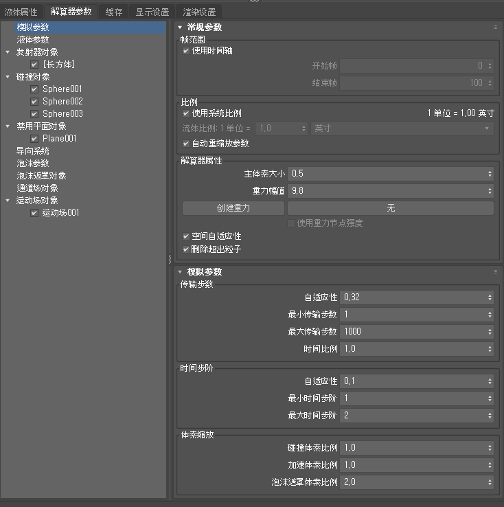 - 设置顶级模拟参数,例如,比例、主体素大小和重力设置,以及传输和时间步阶。
