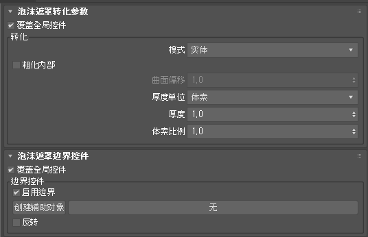 模拟中的所有泡沫遮罩均转化为体素。稍后,体素可用于确定区域是否位于对应的体积内。“转化”选项控制如何体素化关联的遮罩。对于泡沫遮罩,每个体素的基面宽度是“模拟参数”中“主体素大小”设置与此面板中“体素比例”设置的乘积。