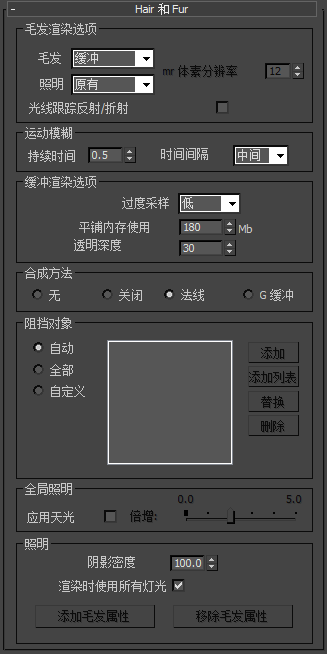 此设置用于选择哪些对象将阻挡场景中的毛发,即如果对象比较靠近摄影机而不是部分毛发阵列,则将不会渲染其后的毛发。默认情况下,场景中的所有对象均阻挡其后的毛发。
