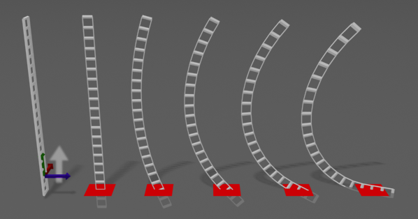 在下一个演示中,“根厚度”设置从左到右为 2.0、10.0、20.0 和 30.0。对于实例几何体,“根厚度”值会沿生成的对象高度对对象产生一致的影响,而“梢厚度”值则不会产生任何影响。(“根厚度”和“梢厚度”设置位于“常规参数”卷展栏中。)