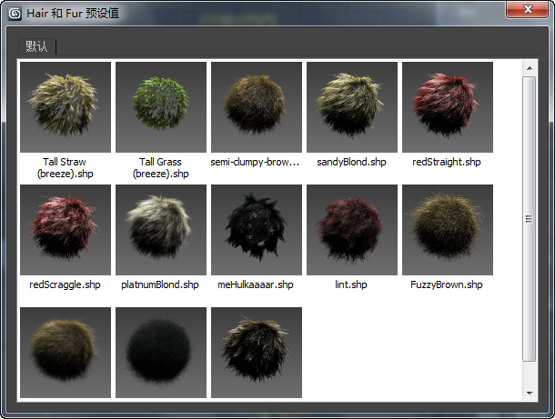 打开“头发预设”对话框,其中包含采用命名样本格式的预设列表。要加载预设值,可双击其样本。3ds Max 附带了若干示例预设。