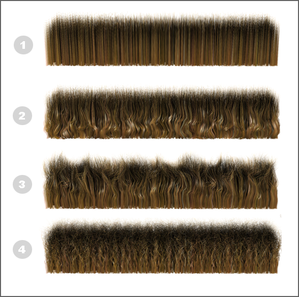 纽结取代的工作和卷发类似,但其是沿导向的整个长度评估噪点查找。其结果是一个噪点模式在比卷发噪点更大的规模上工作。其效果类似于卷发。