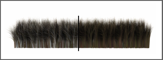 控制自身阴影的多少,即毛发在相同“Hair 和 Fur”修改器中对其他毛发投影的阴影。值为 0.0 将禁用自阴影,值为 100.0 产生的自阴影最大。默认值为 100.0。范围为 0.0 至 100.0。