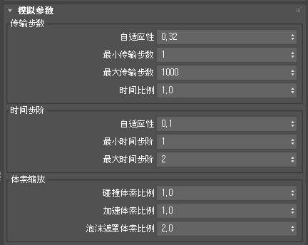 请谨慎操作以免一次增加此设置太多,特别是值接近 1.0 时。这样做可能会导致不必要的长时间计算。另请注意,距离是以体素长度测量的,这意味着较低的主体素大小可能对给定速度的粒子触发附加的迭代。