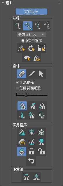 单击“设计发型”开始设计发型。单击“完成发型”禁用样式模式。启用此按钮时,笔刷立即可用。默认情况下,活动工具是“转换”。启用“设计发型”可以访问“选择”卷展栏中的“导向”子对象层级,然后选择所有导向。