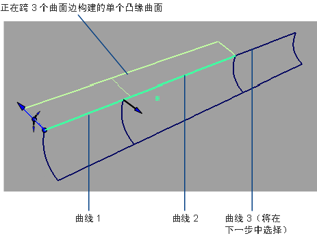 添加每条曲线时,系统会亮显曲线,并会构建一个凸缘曲面。无论您选择了多少个曲面曲线,都将只创建一个凸缘曲面。