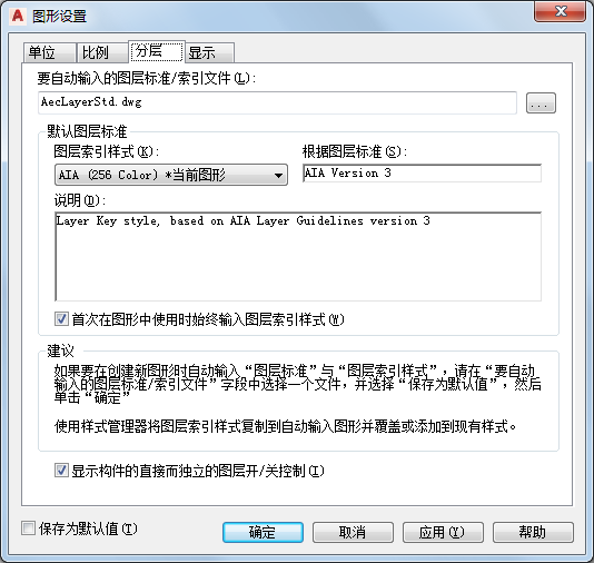 “图形设置”对话框中的图层设置。请注意,图层索引样式设置为自动输入,且“另存为默认值”处于选中状态。这样,即使打开的图形中不含样板,也能确保加载正确的图层索引样式。另请注意,“首次在图形中使用时始终输入图层索引样式”也处于选中状态。这是基于图形的设置,应当在样板中设置。这样能确保正在处理的图形也将使用最新的图层索引样式。