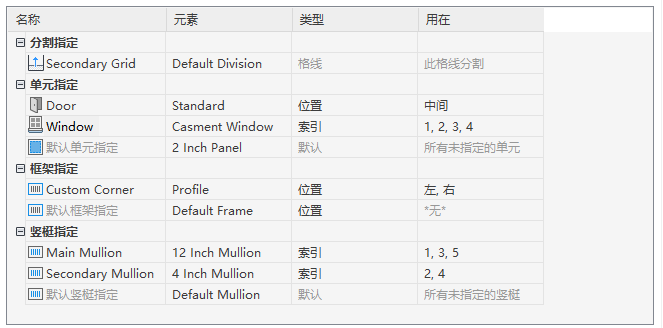 创建幕墙样式的元素定义后,可以将这些定义指定给每种幕墙元素类型:分割、单元内嵌、框架和竖梃。