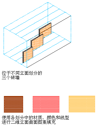 当您在样式中创建细分时,通常希望将这些细分中的对象与其他细分从视觉上加以区分。将材质指定给对象之后,您就可以设置二维立面样式,让它使用材质的填充图案,而使用细分显示特性的颜色与线型。