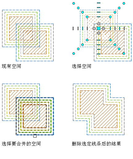 如果第一个空间的手动空间边界没有激活(显示其夹点),则该边界不会包括在合并操作中。第二个空间的边界是否激活与合并过程无关。只要第一个空间的相应边界被激活,这些边界就会合并。如果没有激活第一个空间的某一边界,则该空间的现有边界将保持不变,而第二个空间的相应边界将被删除。这样可能导致生成不规则空间边界。为了避免这种情况,应确保第一个空间上的所有相关边界都已激活,并且可以合并。