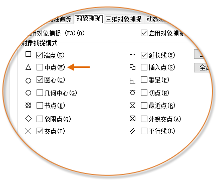 输入 OSNAP 命令以设置默认对象捕捉,也称为“运行”对象捕捉。例如,您可能会发现,默认启用“中点”对象捕捉很有用。