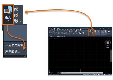 - 在“常用”选项卡中单击“插入”,然后单击“来自库的块”。这将启动 BLOCKSPALETTE 命令。