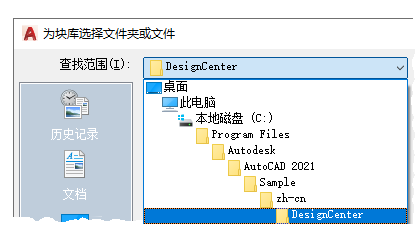 - 导航到“设计中心”文件夹,其中存储有各种示例图形。