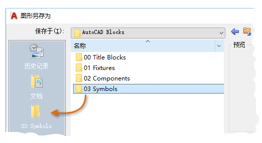 提示: 保存图形用于以后插入时,请导航到某个文件夹,单击鼠标右键,然后创建多个文件夹来组织图形。可以将一个或多个块图形拖动到“放置”栏中,以便于以后访问。