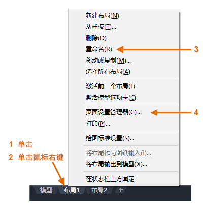 首先,您应在访问布局选项卡 (1) 时,在选项卡 (2) 上单击鼠标右键,然后将该选项卡 (3) 重命名为比“布局 1”更具体的名称。参照特定 ANSI 或 ISO 尺寸的名称可能是一个不错的选择。